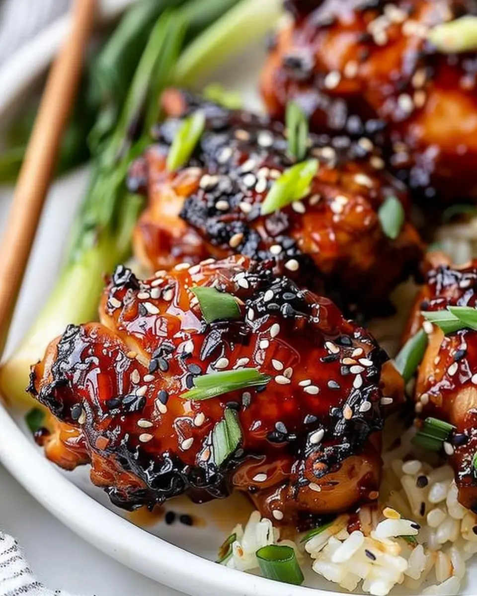 • Chopped green onions: Brightly colored toppings provide a pop against the dark glaze.