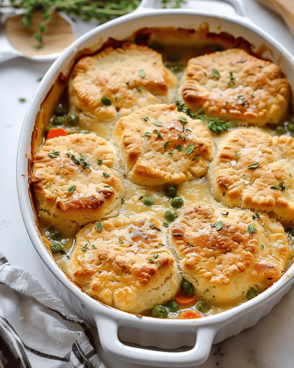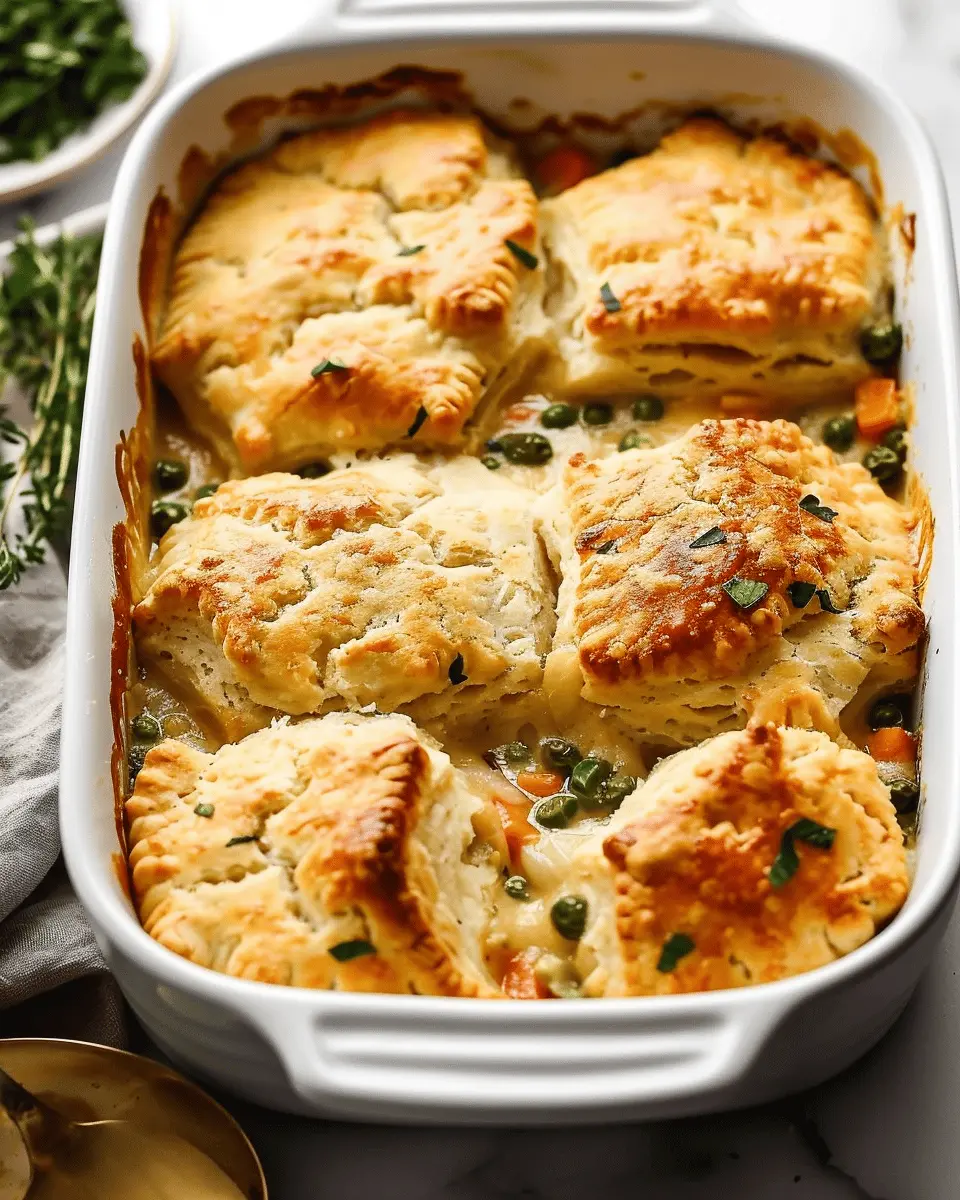 A warm and comforting dish that combines flaky biscuits with a variety of vegetables in a savory sauce.