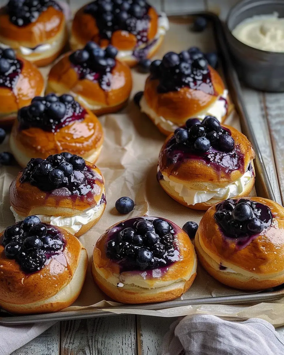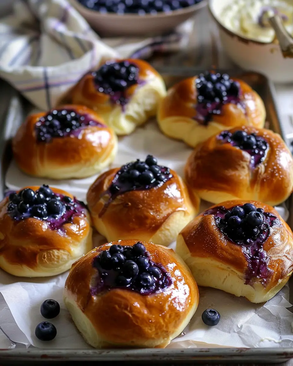 These blueberry cream brioche buns are the perfect blend of sweetness and comfort, made with rich brioche dough and filled with luscious cream and fresh blueberries.