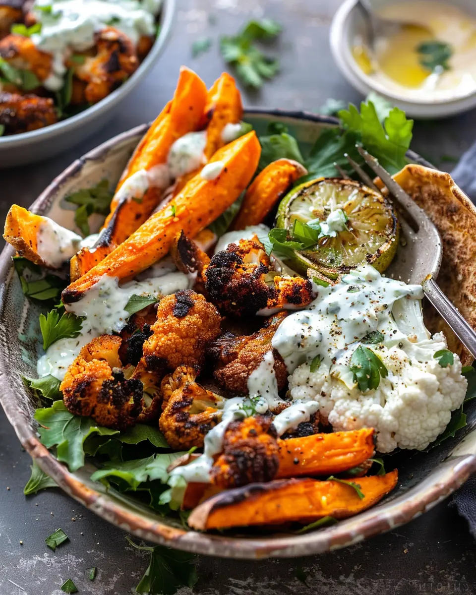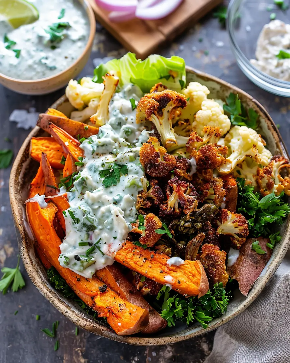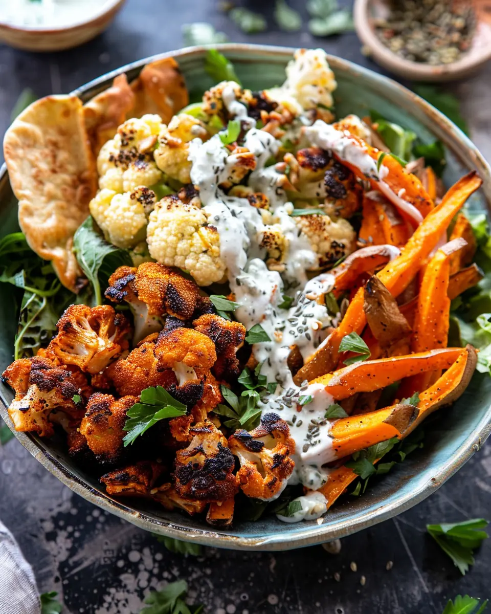 PrintCauliflower Tzatziki Bowls: Easy Sweet Potato Fries Delight