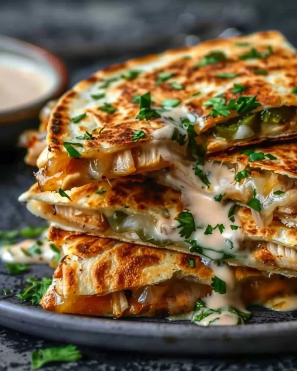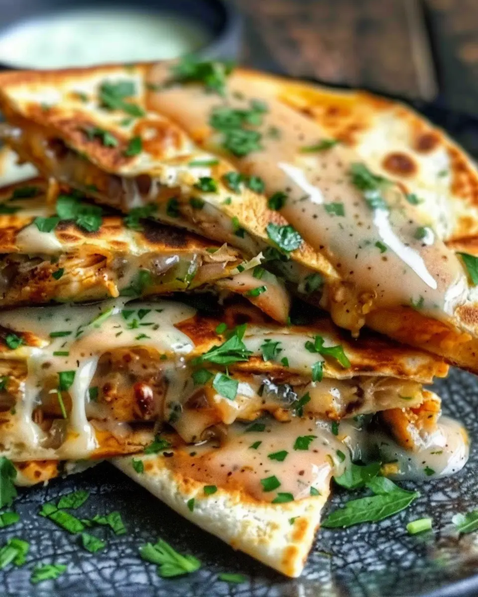 PrintCheesy Hot Honey Chicken Quesadillas with Spicy Jalapeño Cream Sauce: A Bold Indulgence for Your Taste Buds