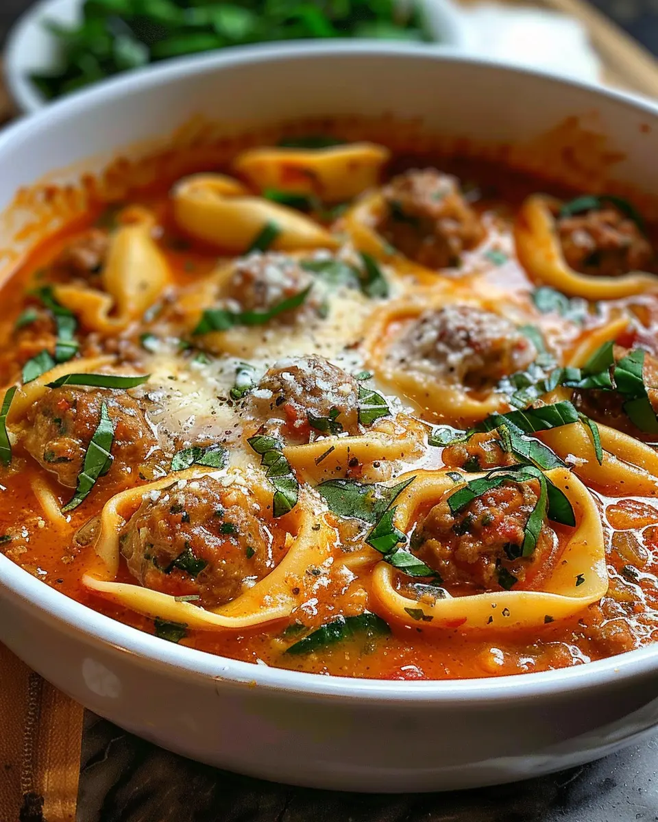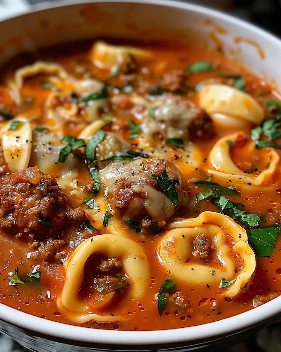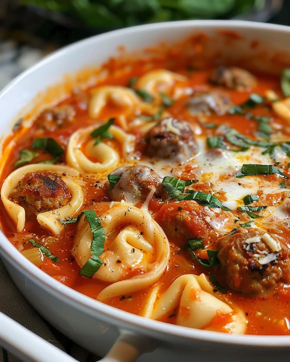 Enjoy a warm and hearty bowl of Cheesy Meatball Tortellini Soup, perfect for cold days and loved by everyone.