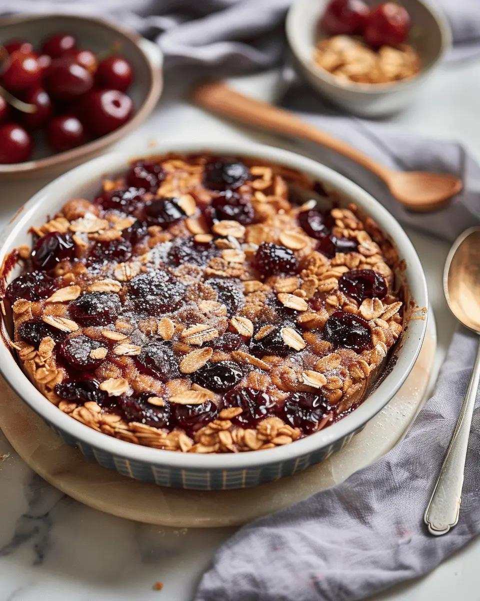 Indulge in a delicious breakfast with these Cherry Bakewell Baked Oats, a perfect blend of flavors that makes your morning delightful.