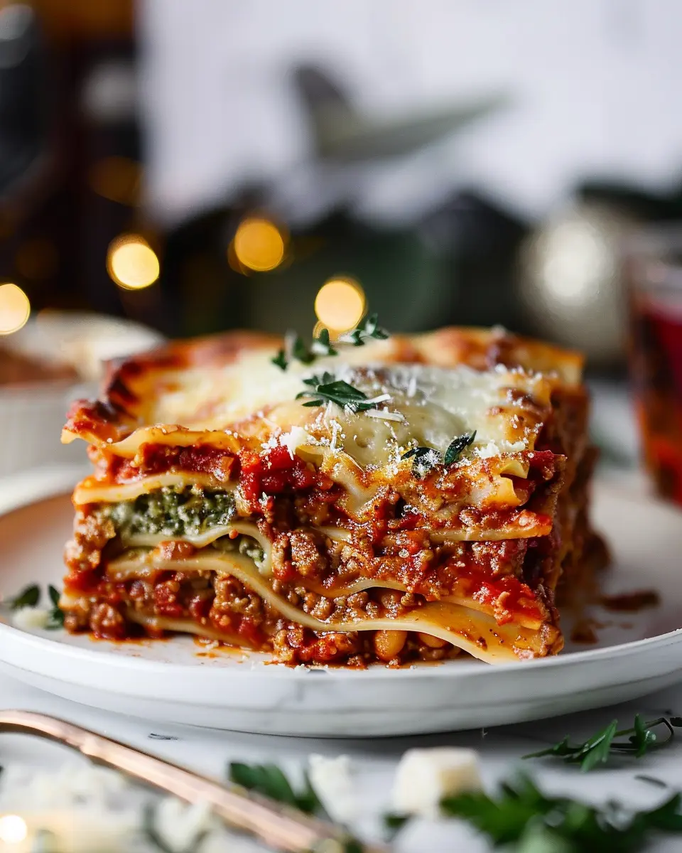 After baking, patience is key. Let your Christmas Eve Lasagna rest for a solid 15-20 minutes. This allows the layers to set, making it easier to serve — and it’s twice as delicious when the flavors have had a little more time to mingle. Use this time to whip up a fresh salad or pour some sparkling cider for a festive touch.