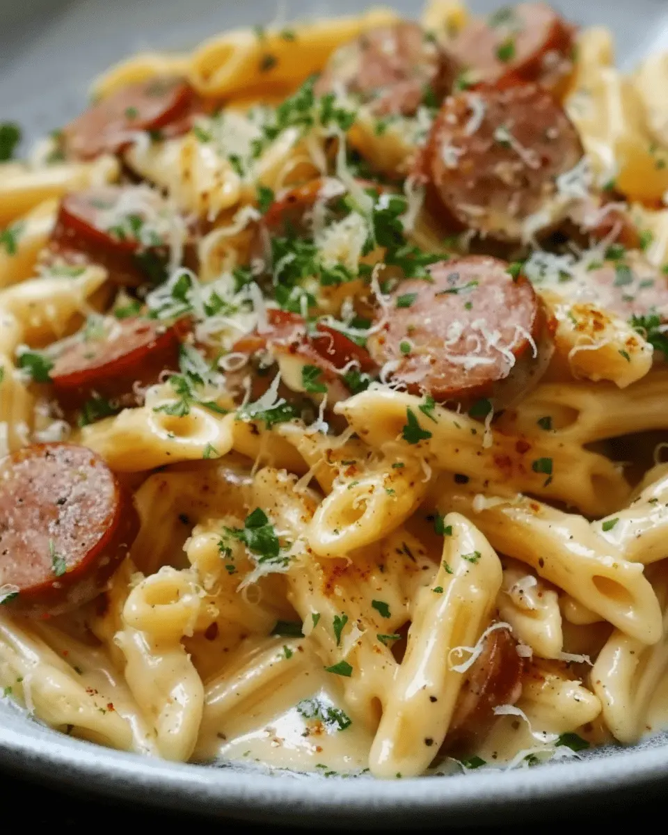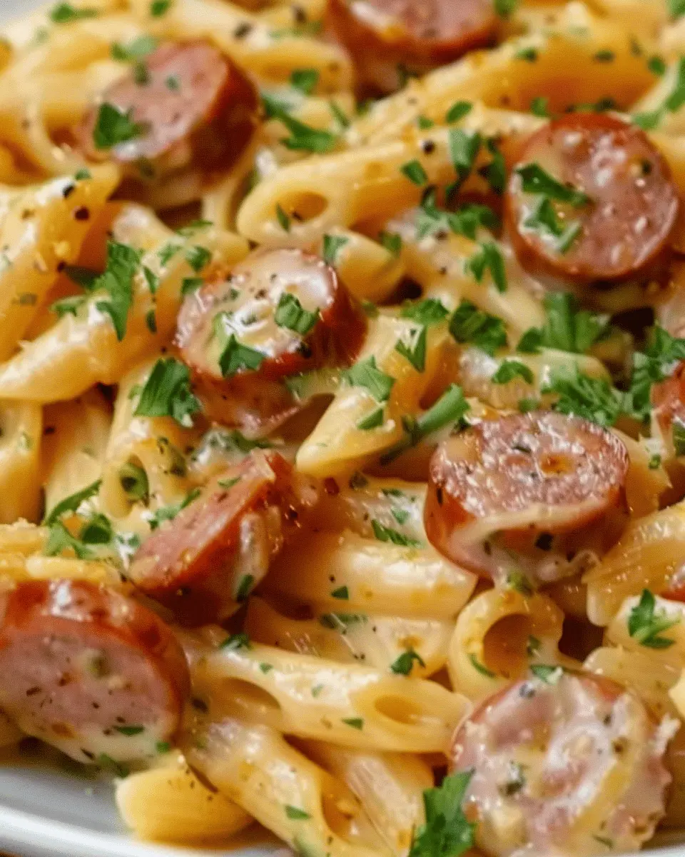 A delicious creamy smoked sausage pasta dish that combines rich flavors for a comforting meal.