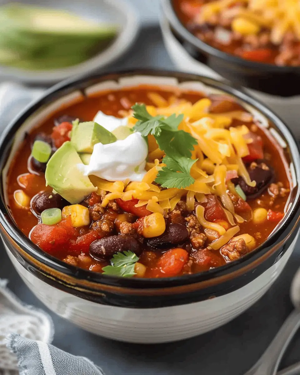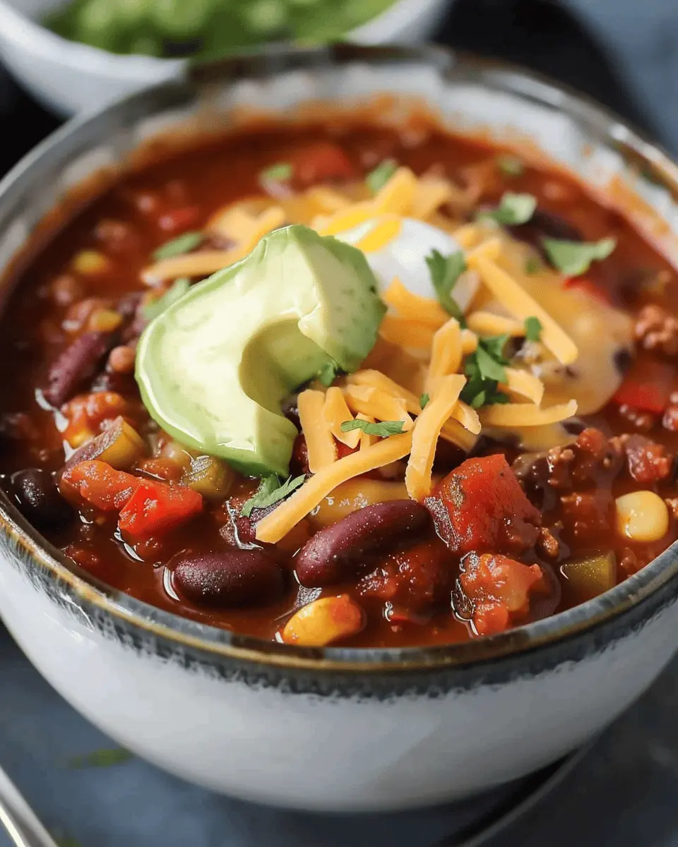 - This chili can be topped with avocado, cheese, or sour cream for added flavor.
