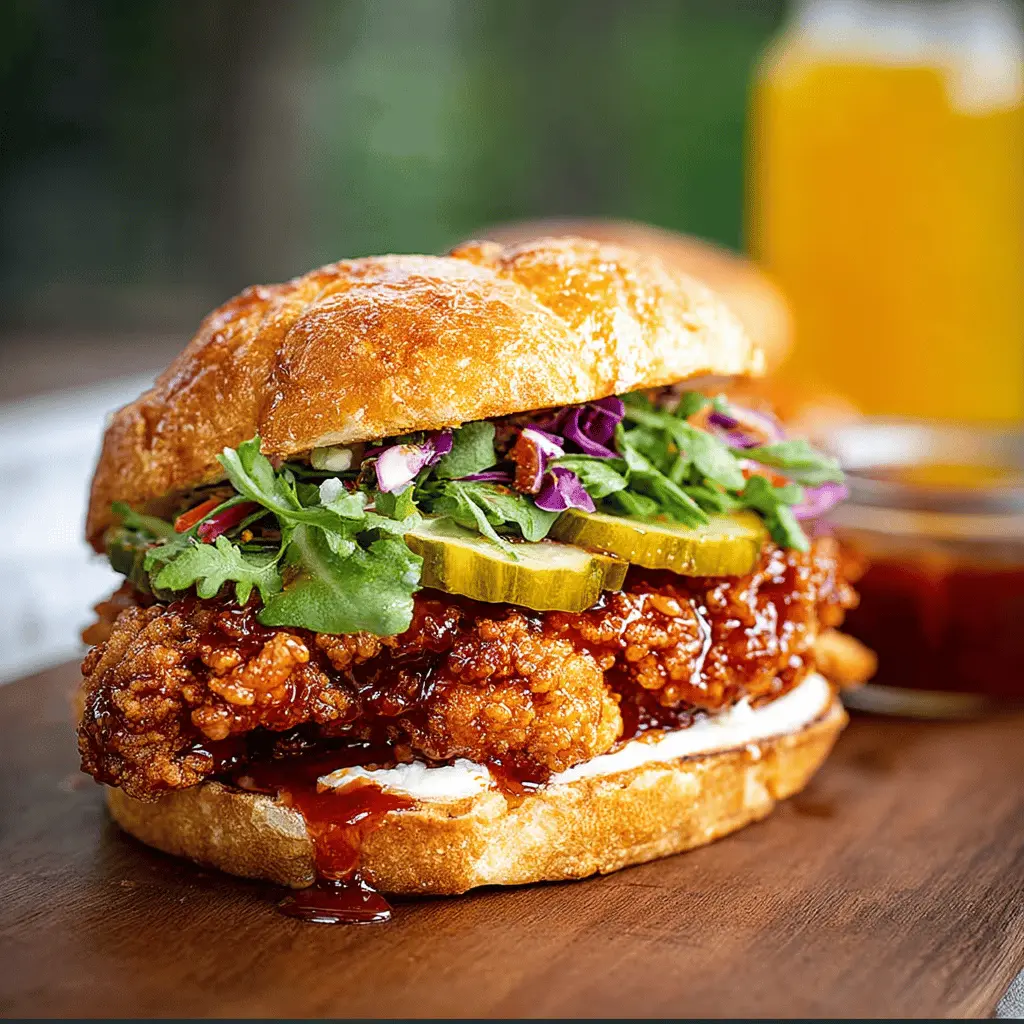 Directions: Start by spreading a generous amount of your hot honey sauce on both sides of your toasted gluten-free bun. Place the fried chicken in the center, followed by fresh greens and pickles.