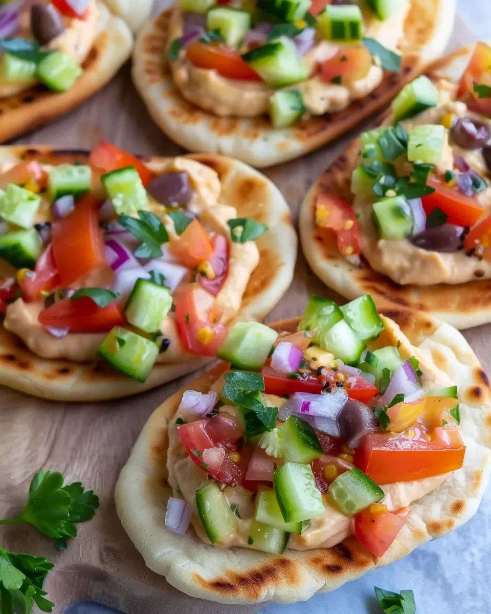 A delightful and convenient appetizer that combines the flavors of a Greek salad with the creamy texture of hummus, all served on warm naan bread.