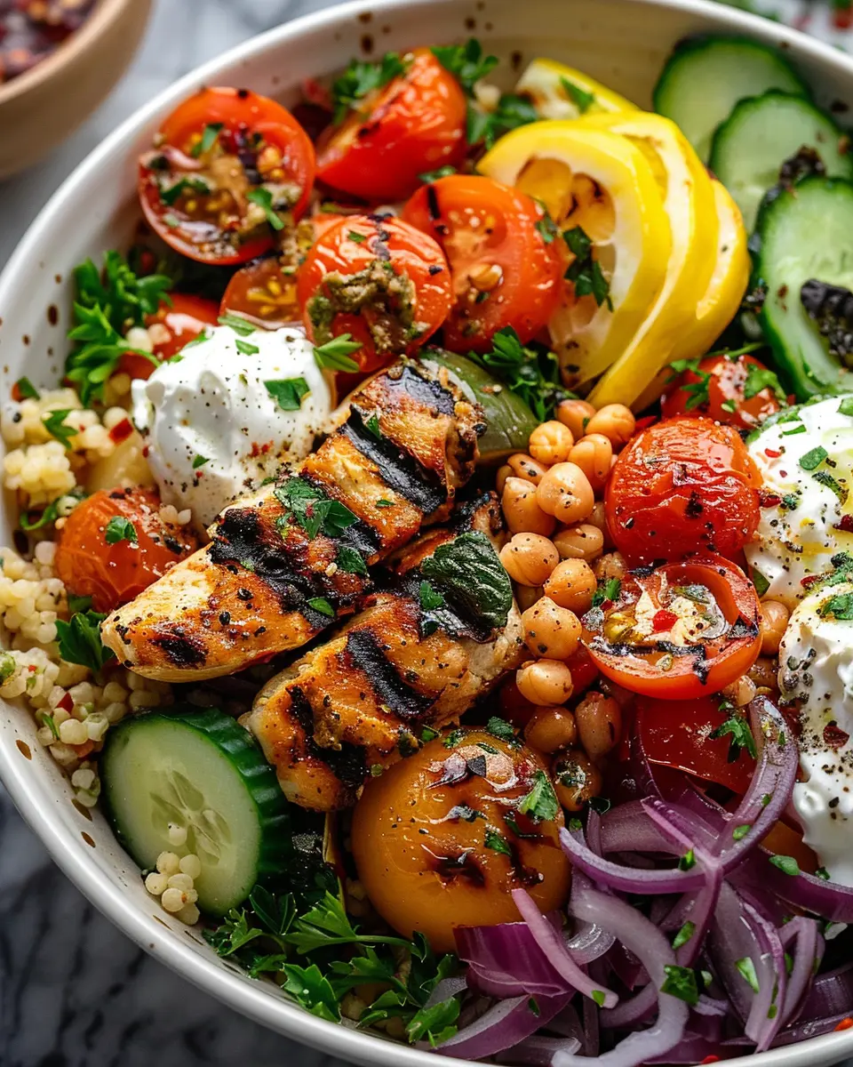 While the classic healthy grilled Mediterranean bowl often features chicken, feel free to experiment with a variety of proteins! Turkey bacon or chicken ham can add a delicious twist, making each bowl unique. If you prefer seafood, adding grilled shrimp or salmon not only boosts the flavor but also provides heart-healthy omega-3 fatty acids. A lean cut of beef can also work wonderfully, especially when seasoned with Mediterranean spices—think olive oil, lemon, and garlic.