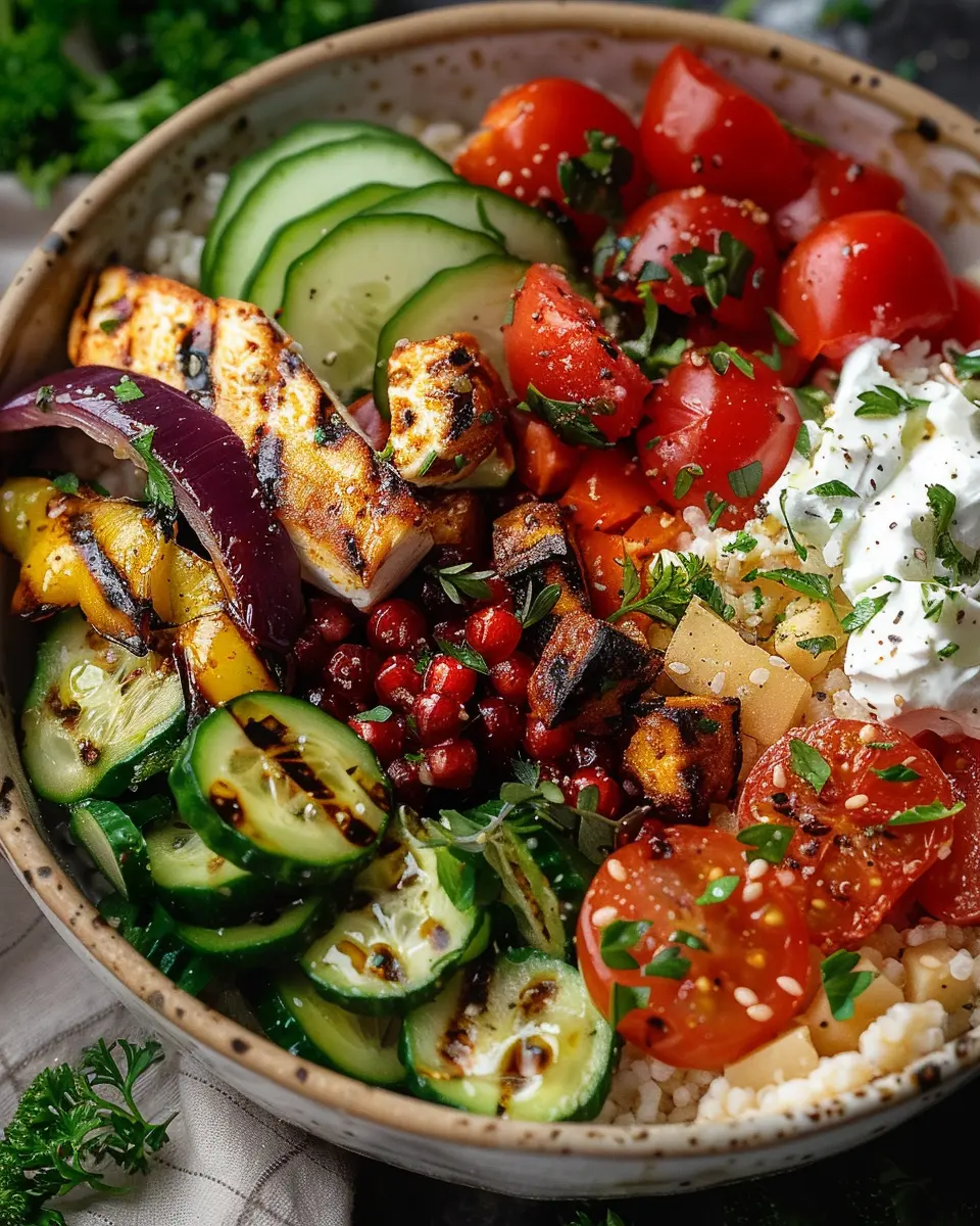 If you haven’t yet tried the healthy grilled Mediterranean bowl, now is the perfect time! This vibrant dish is not only a feast for the eyes but also a powerhouse of flavor and nutrition. With its blend of fresh vegetables, protein-packed ingredients like turkey bacon and chicken ham, and delightful herbs, it’s sure to please your palate while fueling your day.