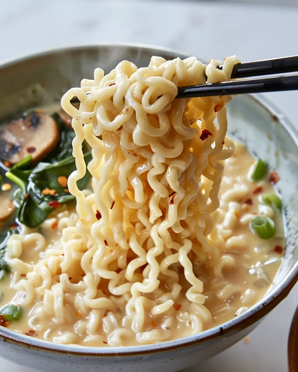 - Divide the cooked ramen noodles into serving bowls and generously ladle the creamy mushroom broth over them.