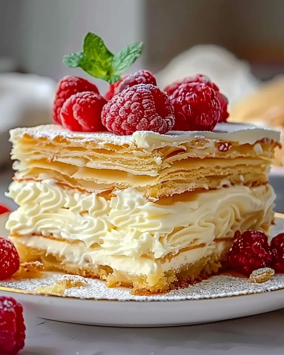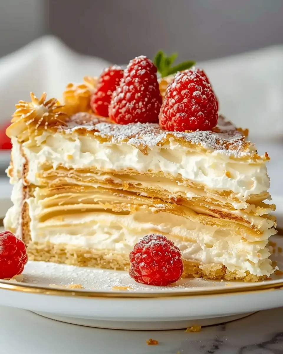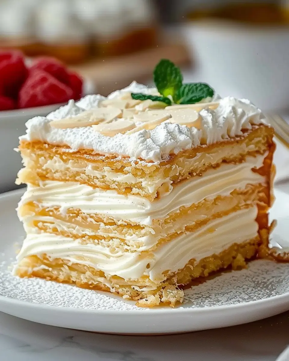 Creating a visually stunning dessert is all about presentation, especially with an Irresistibly Creamy Easy Napoleon Cake. Start by placing your cake on a beautiful cake stand to elevate its charm. Dust the top lightly with powdered sugar for that elegant touch, and consider adding fresh berries—like strawberries or raspberries—for a splash of color and freshness. You can even create a simple raspberry coulis to drizzle over individual slices, enhancing both appearance and flavor.