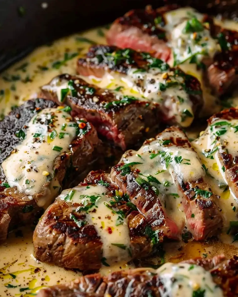 - Drizzle that luxurious Parmesan cream sauce over the sliced steak and garnish with fresh herbs like parsley or chives for color.