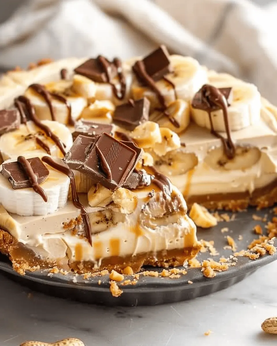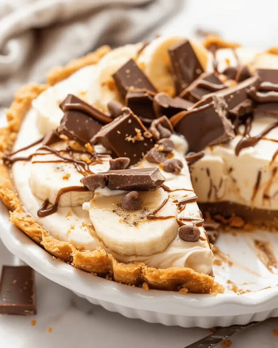Indulge in the creamy and decadent layers of this No Bake Reese Peanut Butter Chocolate Banana Cream Pie.