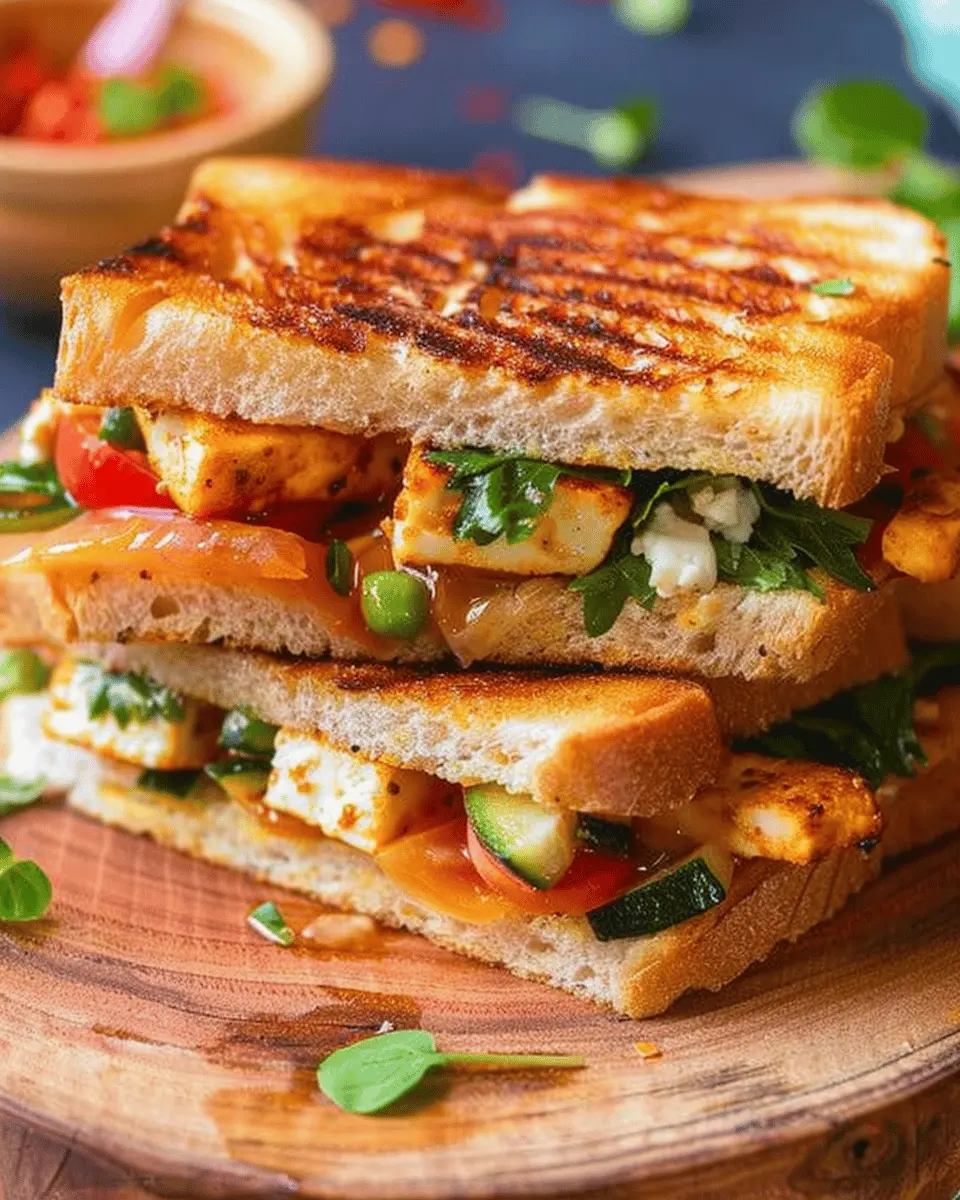 A delicious and quick sandwich made with toasted paneer and fresh veggies, perfect for snacks.