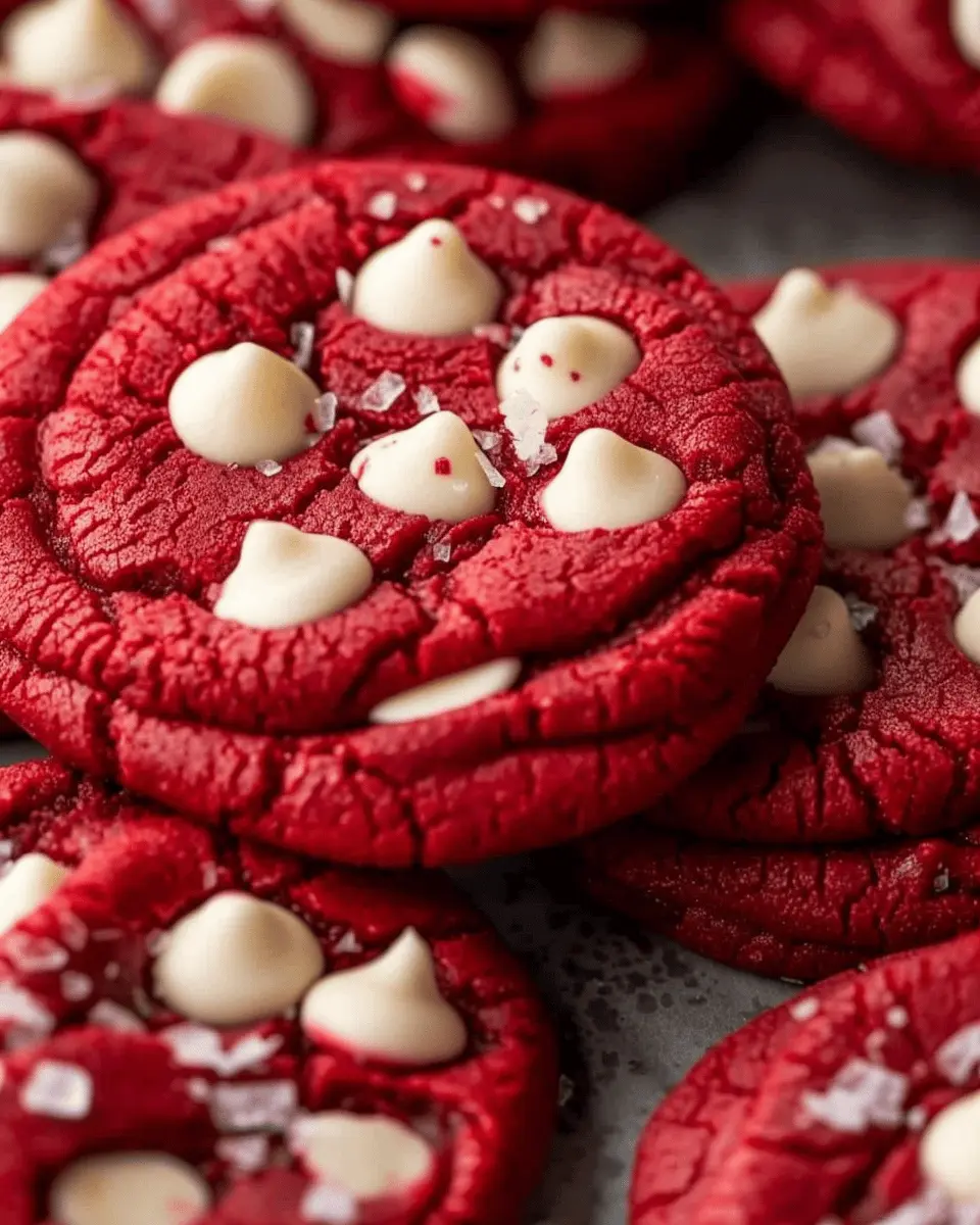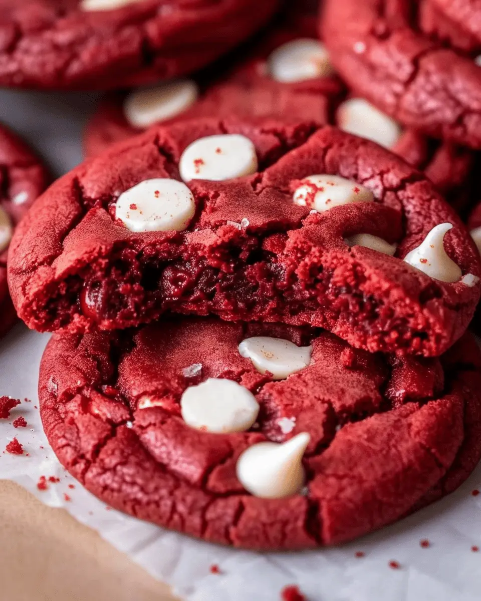 Indulge in these soft and chewy red velvet cookies, the perfect treat for sweet lovers.