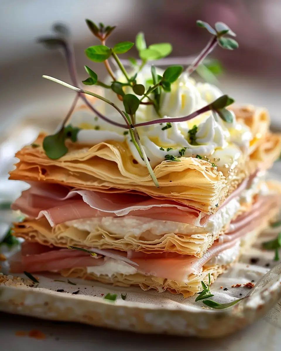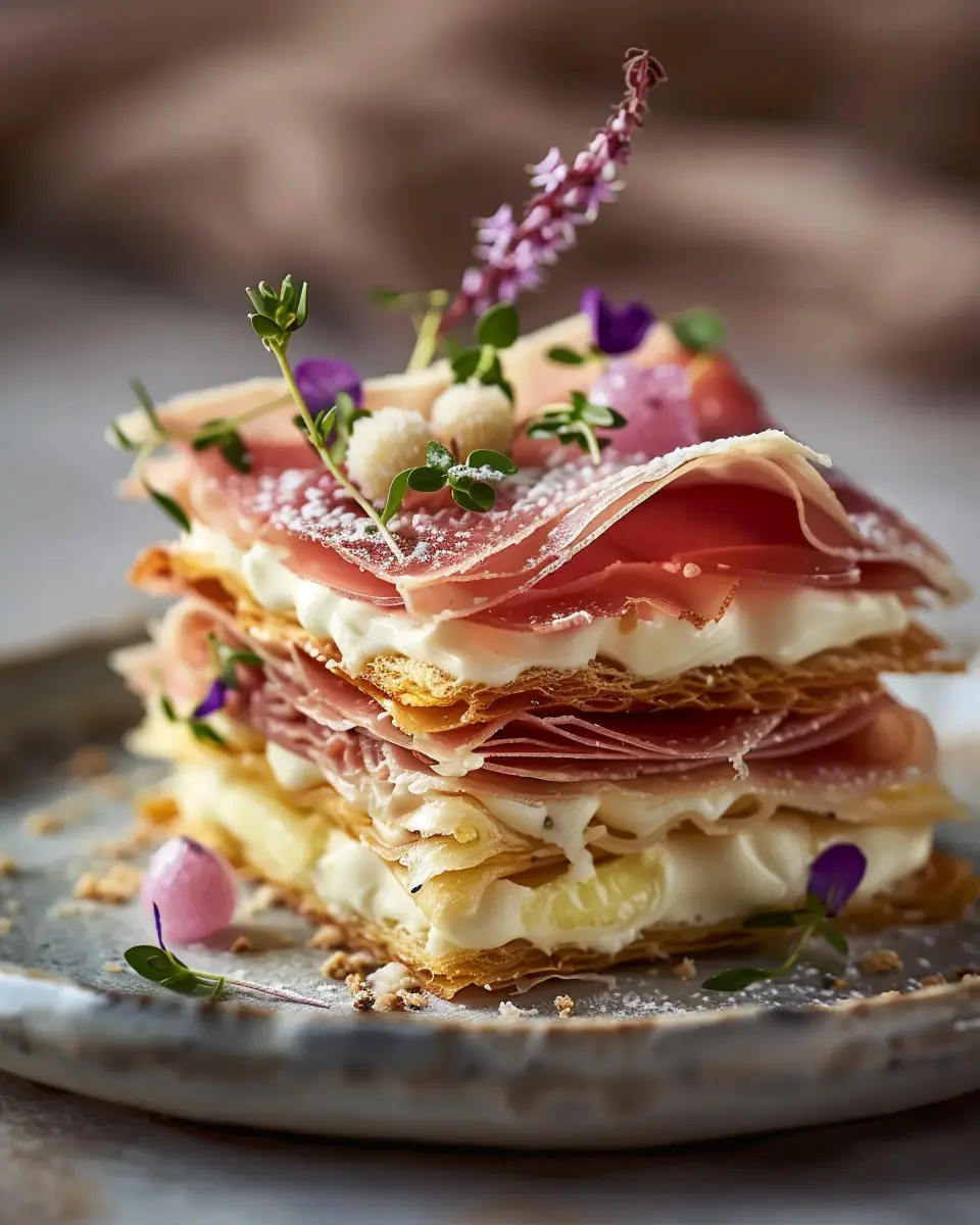 • Versatile Ingredients: The beauty of this recipe lies in its flexibility. While the classic mille-feuille is usually sweet, our savory twist incorporates layers such as rich lemon ricotta, turkey bacon, and chicken ham. This opens the door to endless variations based on what you have on hand.