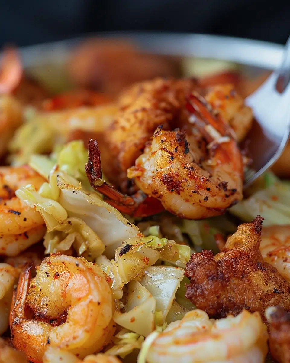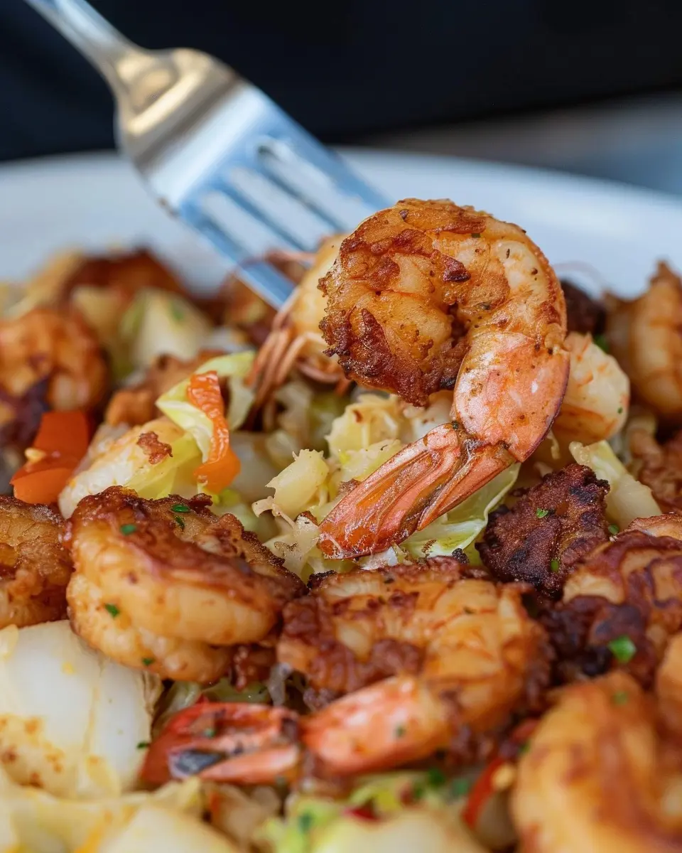 A comforting dish that combines the flavors of fried cabbage and shrimp, perfect for family dinners.