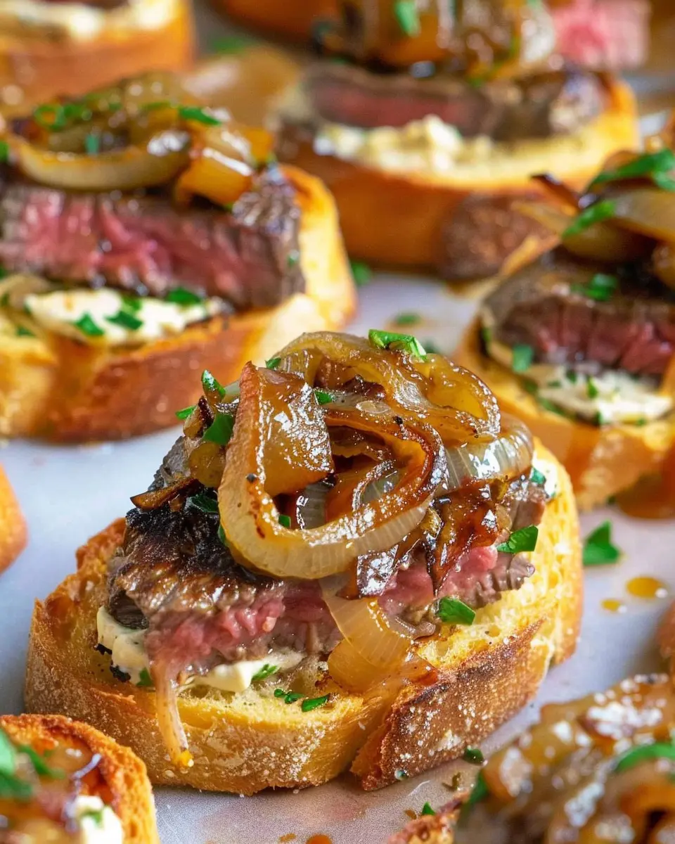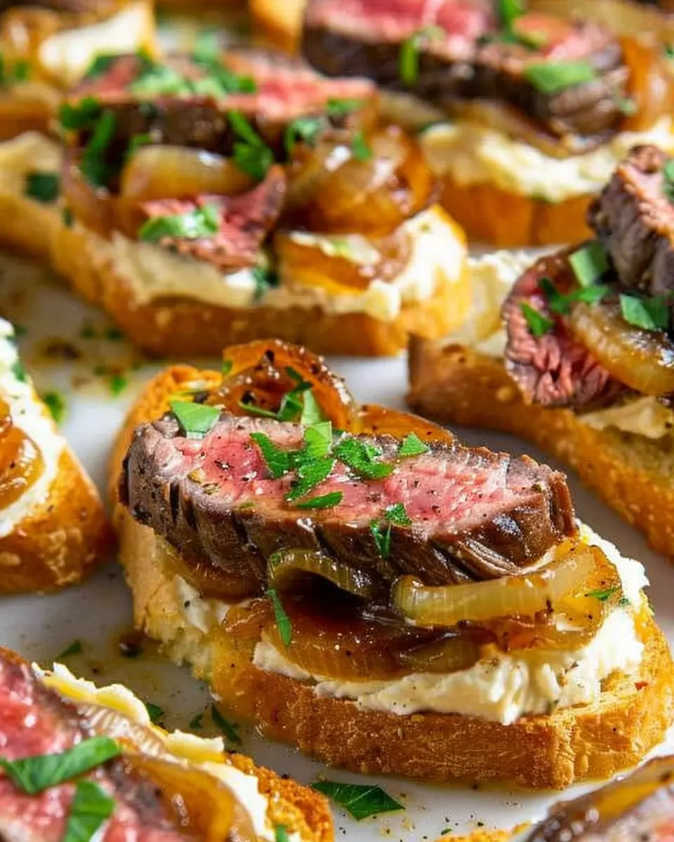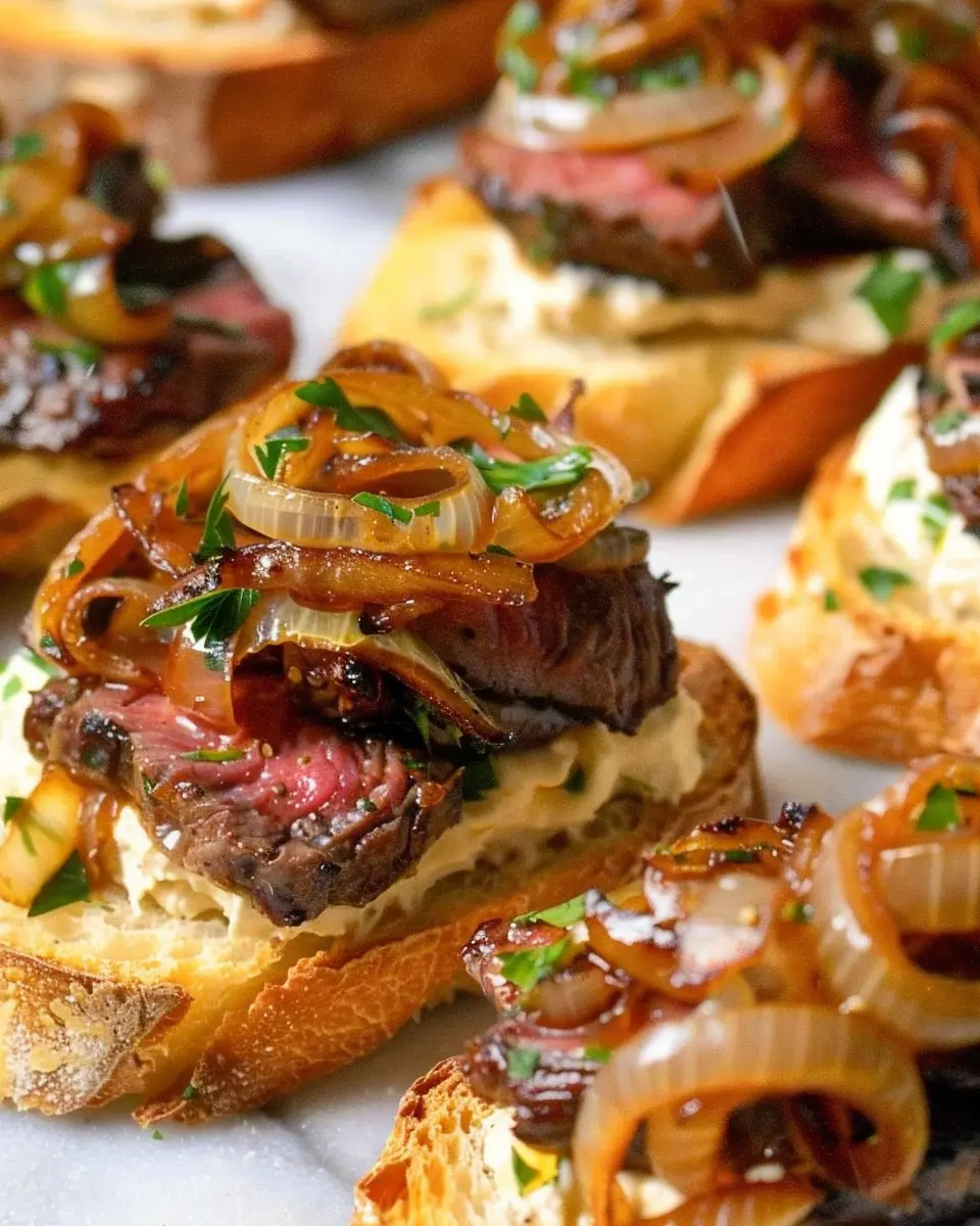 - Assemble crostini by layering steak on toasted baguette, topping with caramelized onions and a dollop of horseradish sauce.