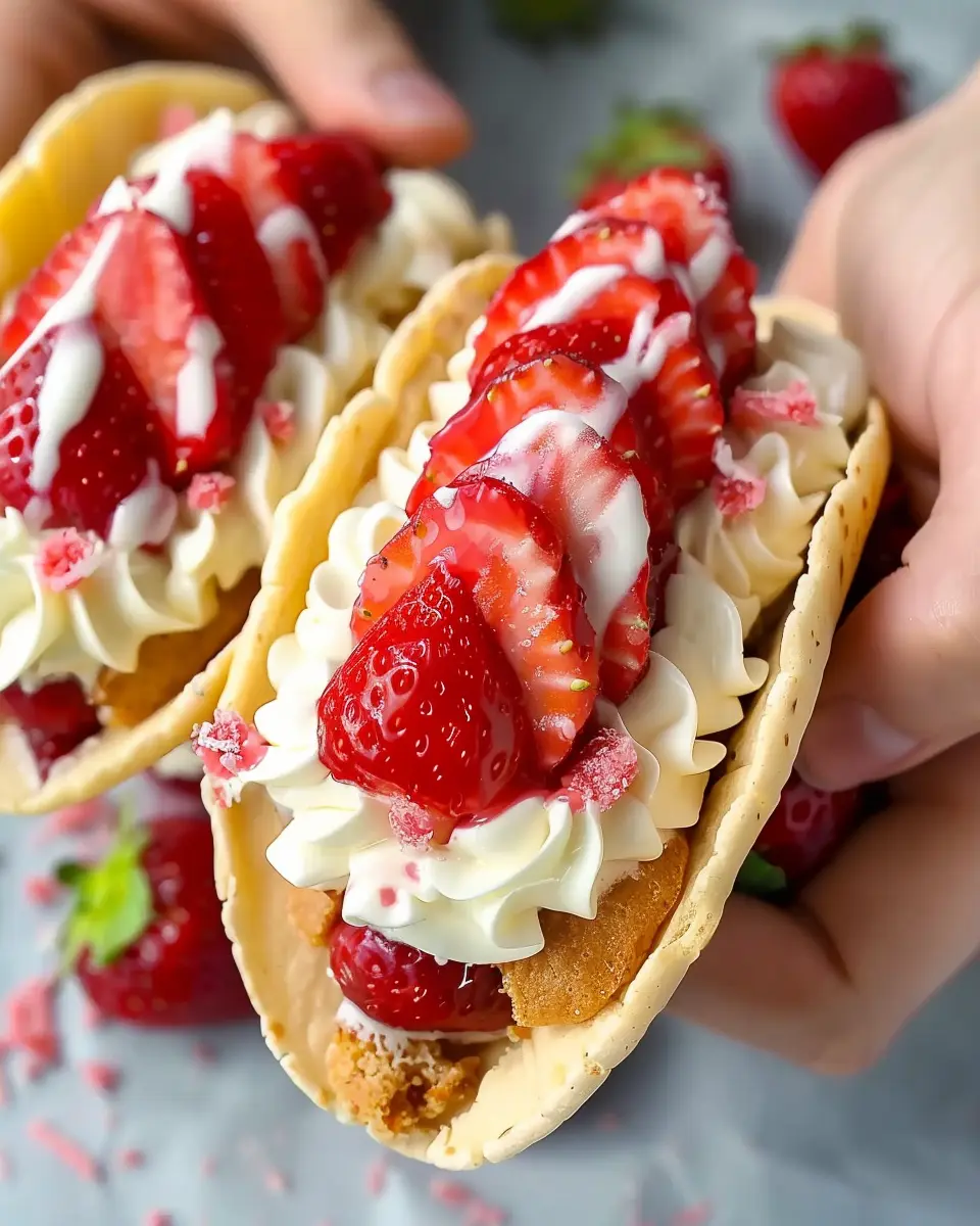 Versatile Pairings: What’s great about strawberry cake tacos is how easily you can customize them. Want to switch up the filling? Try adding some crushed graham crackers for crunch, or switch to a lighter yogurt base if you’re looking for a healthier alternative. The world is your taco shell!